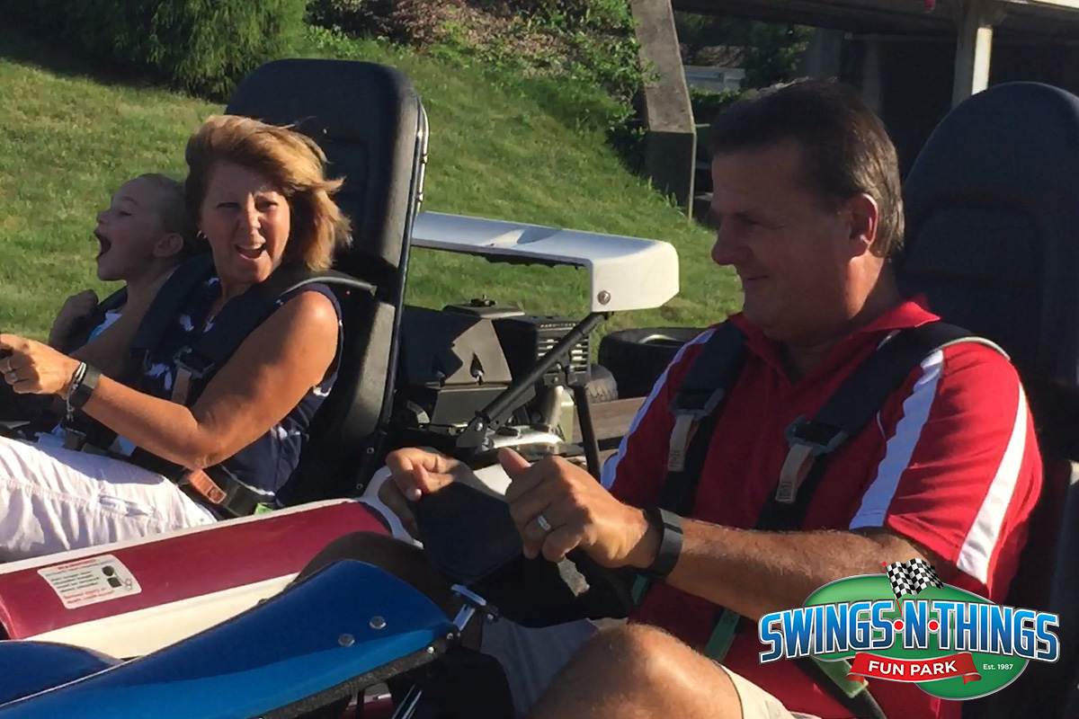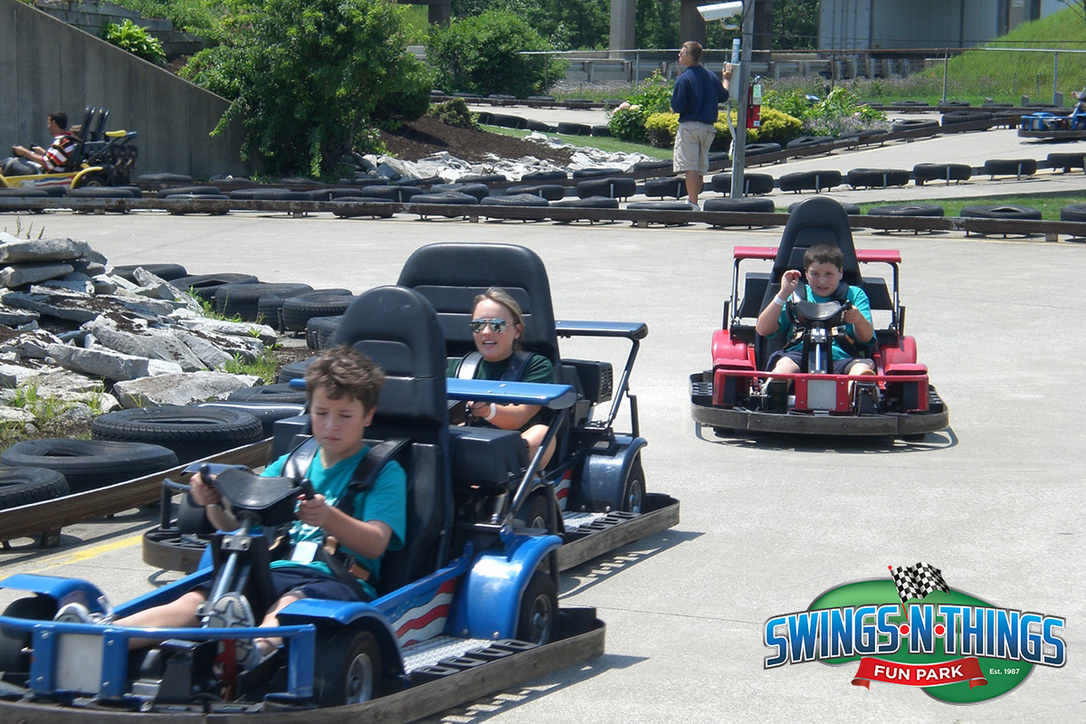 When the Flag drops, you’re off and racing on the Swings-N-Things Grand Prix Go-Kart Track!
